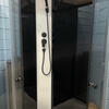 В изготовлении кабин используем закаленное стекло толщиной 4 мм. С целью достижения увеличенной жесткости конструкции горизонтальный профиль ложится на бортик (а не рядом с бортиком) и не имеет движения по поддону, а отсутствие зазора между профилем и бортиком поддона препятствует скоплению грязи.