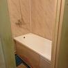 выпихнули ванну кое как предварительно убрав унитаз иначе не влазила ванна вместе с каркасом и прямо скажем в собранном виде нелегкий, но поставить его на место так и не получилось мешала канализационная труба и ванну втолкнуть к стене просто невозможно, пришлось думать,в итоге отсоединили каркас от ванны, каркас без ванны встаёт спокойно на место, поставили каркас на табуретки и ванну на каркас, тоже ванна без каркаса полезла на свое место спокойно лежа под ванной закрутили саморезы на закладные ДСП лист на саморезы на старые дырочки аккуратно, отрегулировали по уровню затянули
