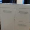 Корпус - влагостойкая ЛДСП. Фасады: МДФ, покрытая белой глянцевой пленкой ПВХ. Размер: 776х434х800 мм. Оснащение: 1 дверца, 2 выдвижных ящика, 1 полка, лицевая фурнитура матовый хром, регулируемые опоры. Количество классических петель: 1 шт. Количество петель с доводчиком: 1 шт.